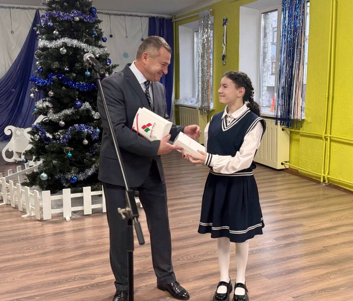 Особым и трогательным моментом мероприятия стало вручение подарка учащейся Тулуповой Юлии. Юлия, ребенок с инвалидностью по слуху, написала письмо Деду Морозу, в котором выразила свое заветное желание – получить телефон. Александр Горошкин с радостью исполнил эту мечту, вручив Юлии долгожданный подарок.