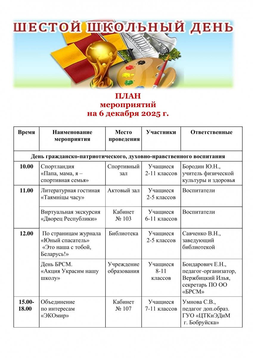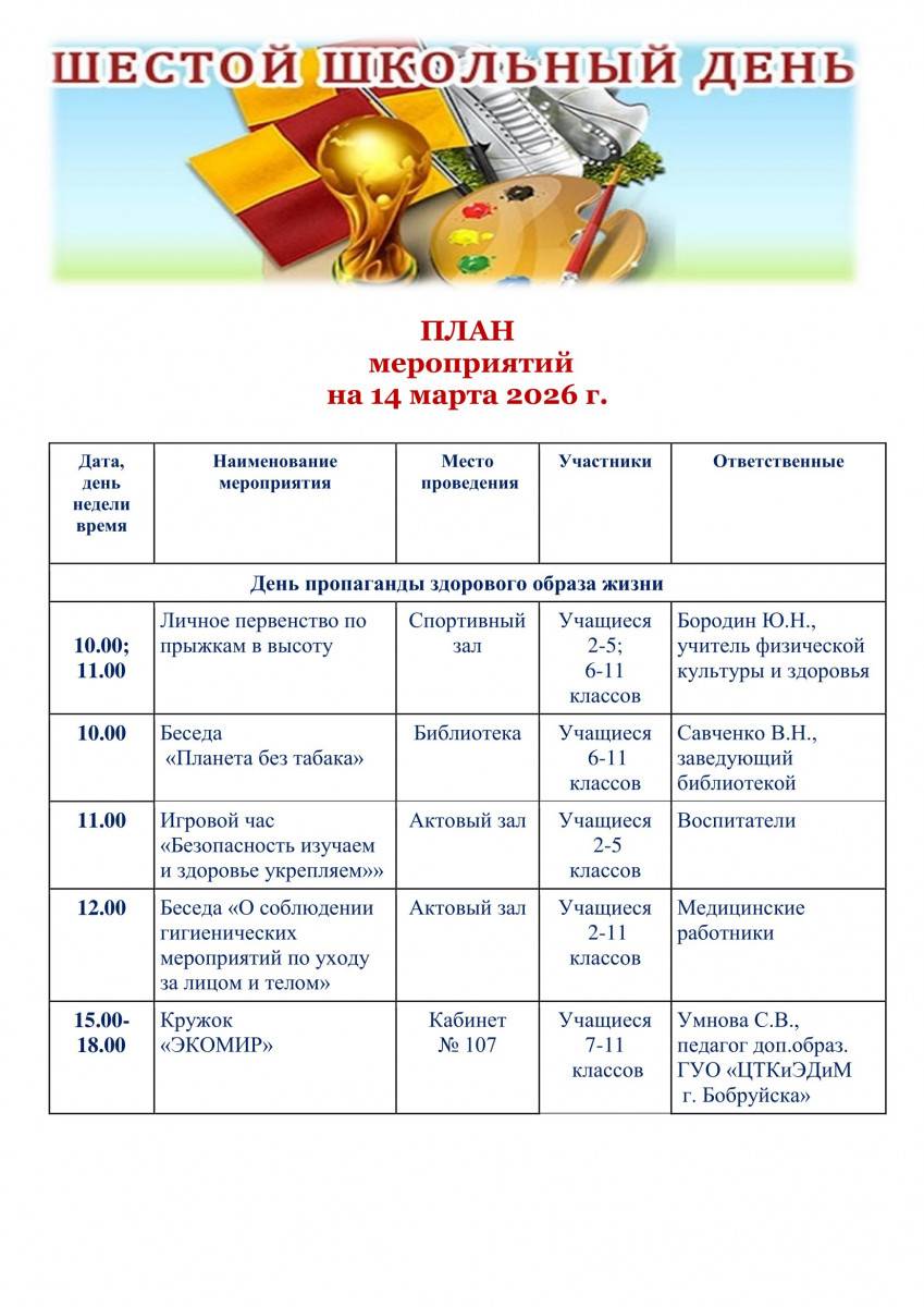 Шестой день недели — суббота — является органичной частью целостной учебно-воспитательной системы школы. Одной из важных задач, стоящих пред педагогическим коллективом школы, является эффективная организация воспитательной работы в шестой школьный день. Она планируется и проводится в соответствии с общешкольным планом работы школы, органично дополняя и продолжая его. Особое внимание уделяется проведению в субботу физкультурно-оздоровительной и спортивно-массовой работы.